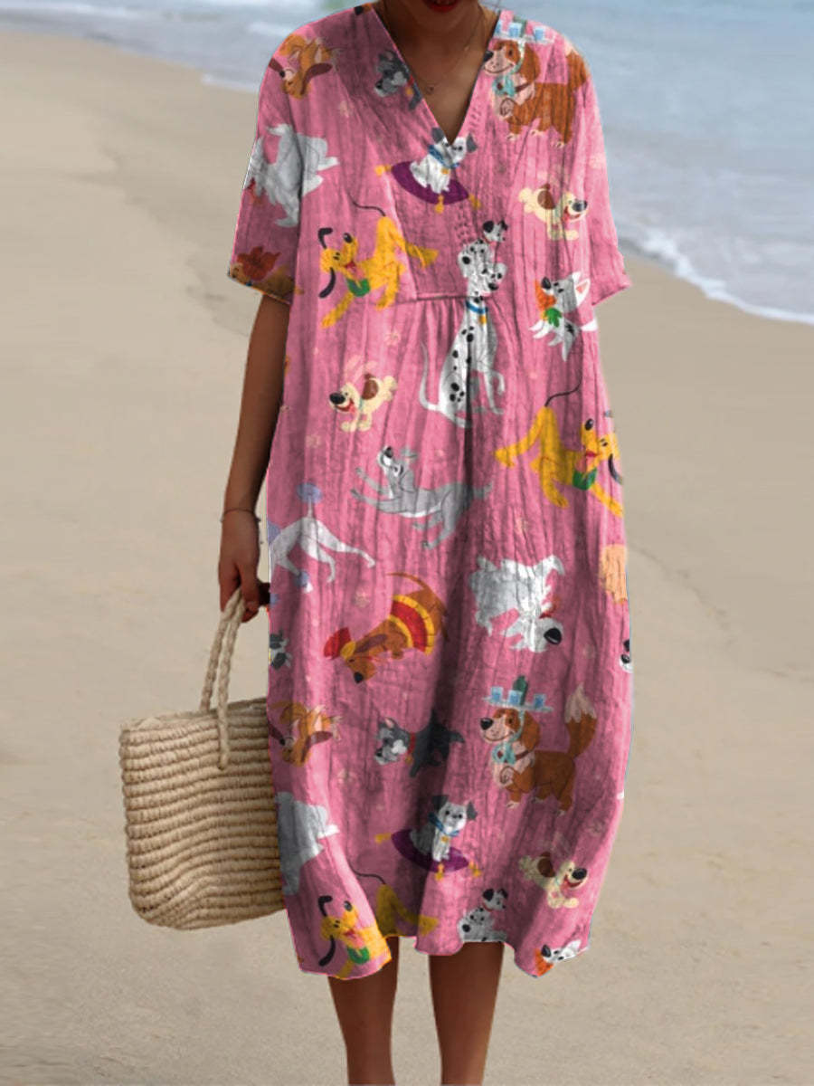 Vintage Animal Art Print V Neck Elegant Chic Loose Short Sleeve Midi Dress