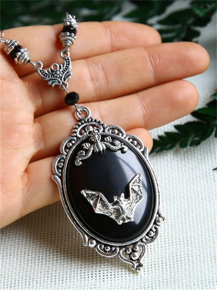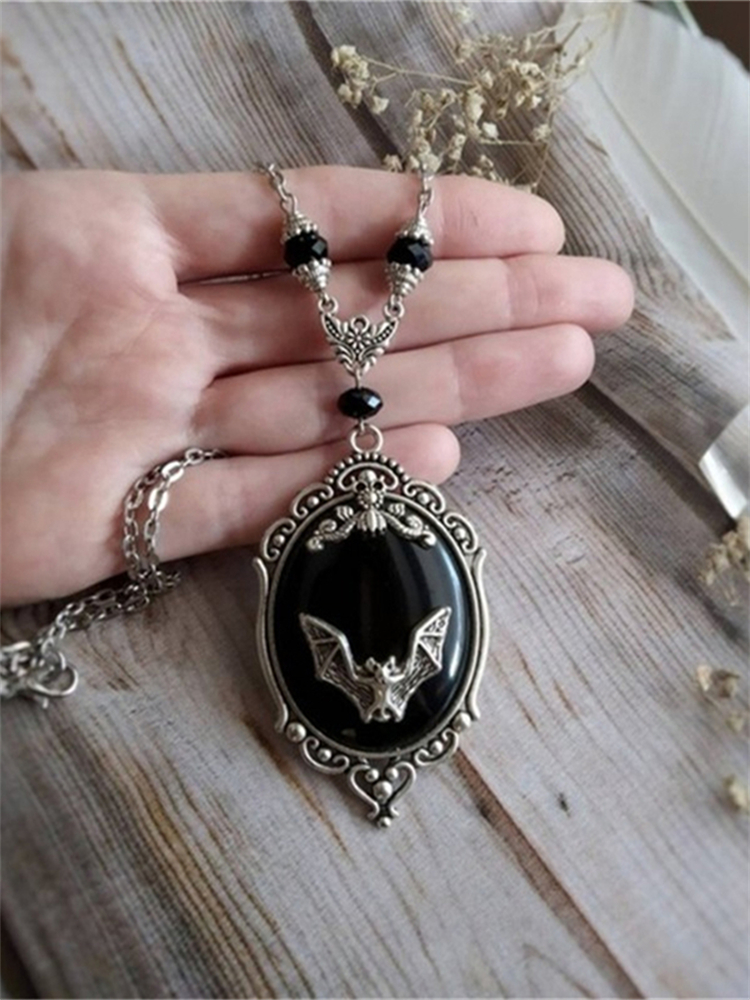 Vintage Bat Carved Black Stone Necklace