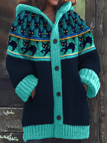 Vintage Black Cats Yoke Contrast Cozy Knit Hooded Cardigan