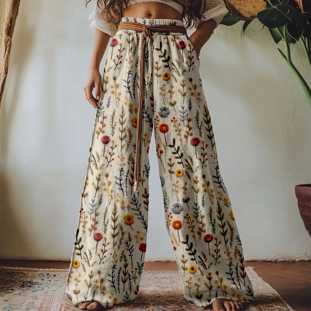 Vintage Boho Flowers Embroidered Linen Blend Casual Pants