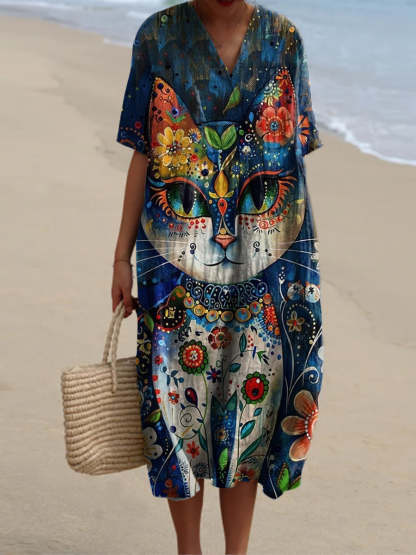 Vintage Cat Art Print V-Neck Elegant Chic Loose Short Sleeve Midi Dress