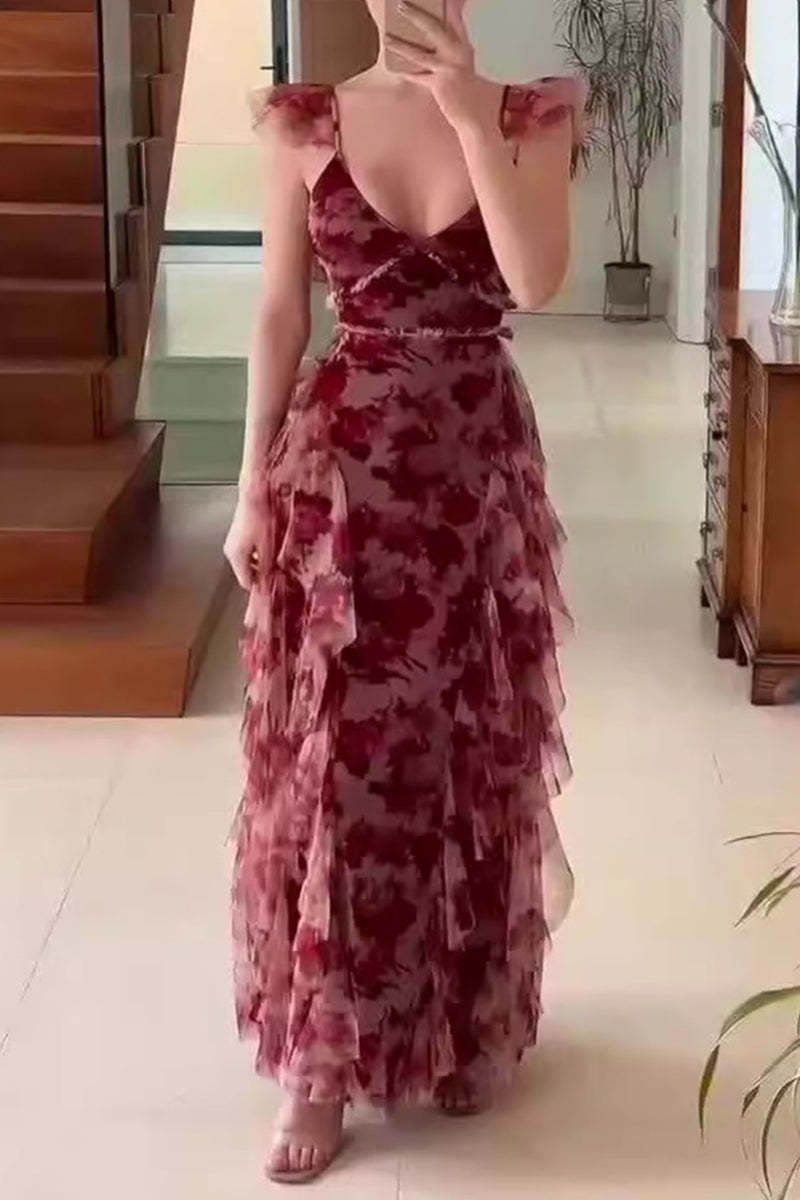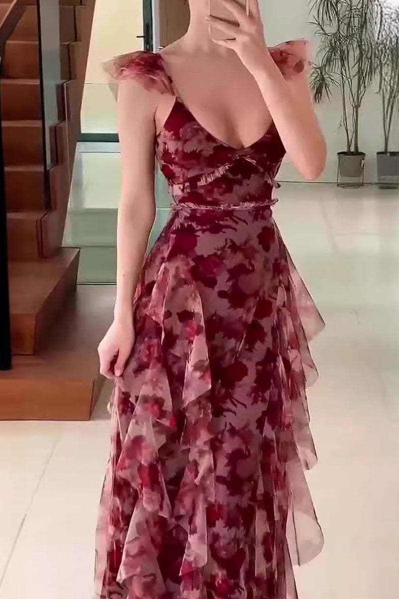 Vintage Elegant Flowers Flounce V Neck One Step Skirt Dresses
