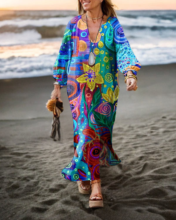 Vintage Floral Abstract Art Long Sleeve Cardigan Maxi Dress