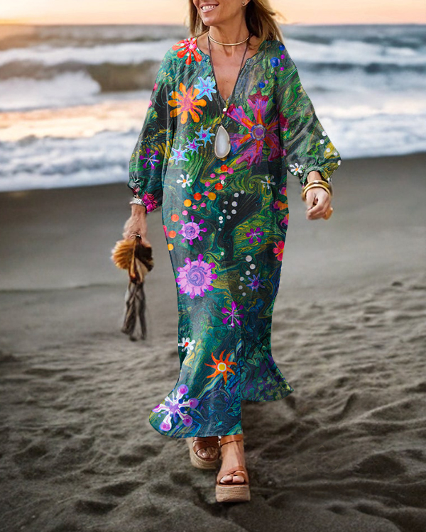 Vintage Floral Art Long Sleeve Cardigan Dress