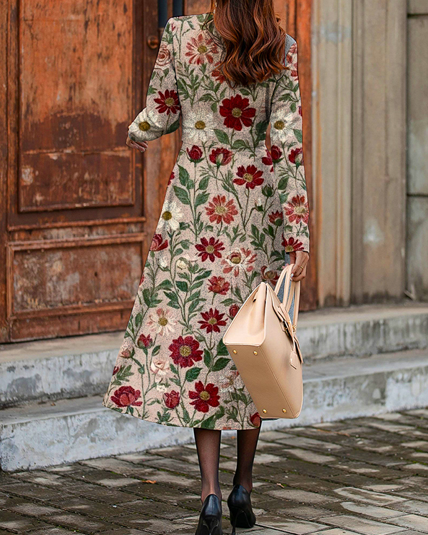Vintage Floral Art Print Round Neck Long Sleeve Dress