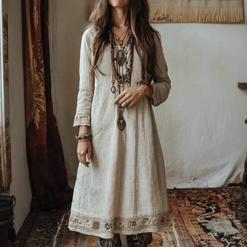 Vintage Floral Embroidered Linen Blend Midi Dress