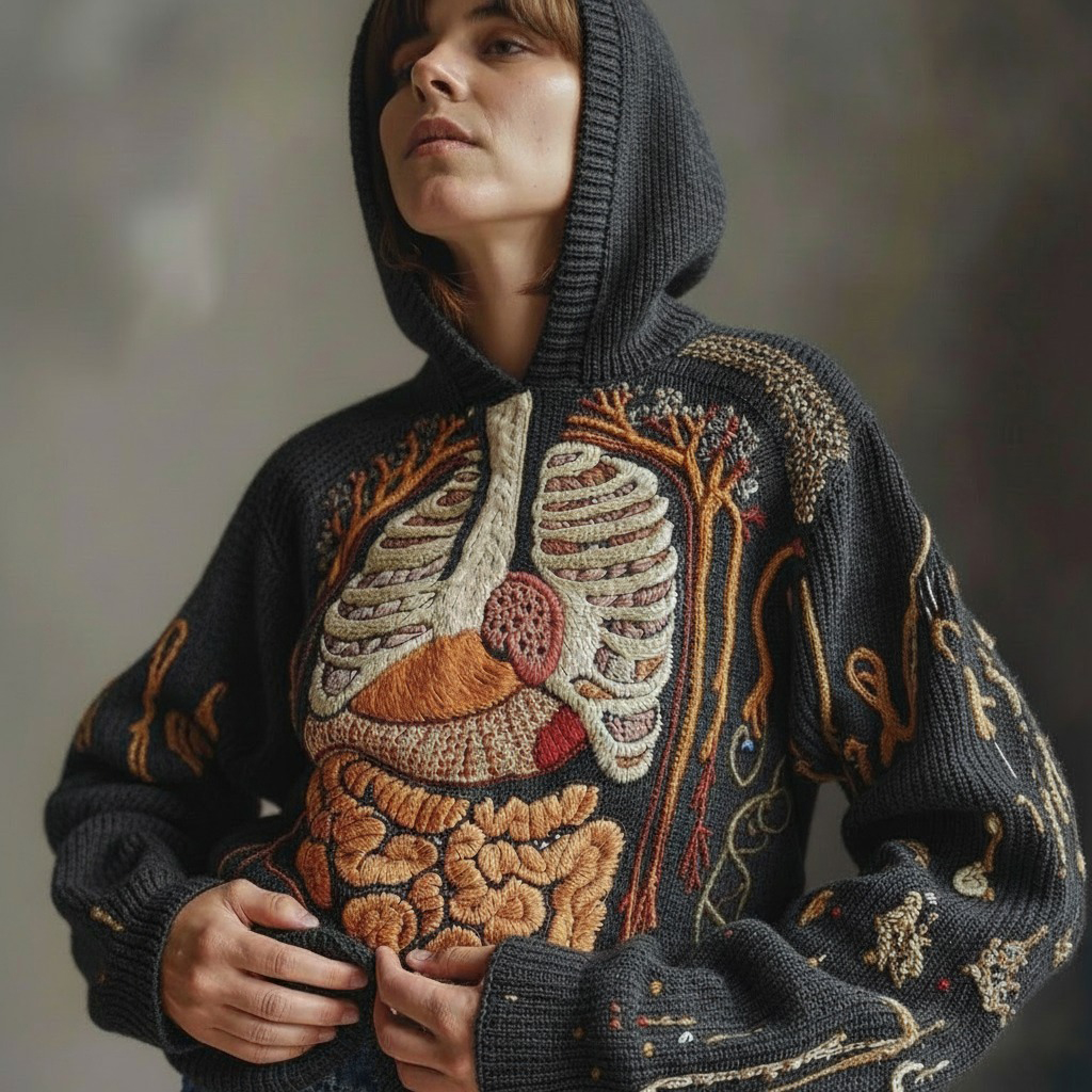 Vintage Halloween Anatomy Art Chunky Knitted Hooded Sweater