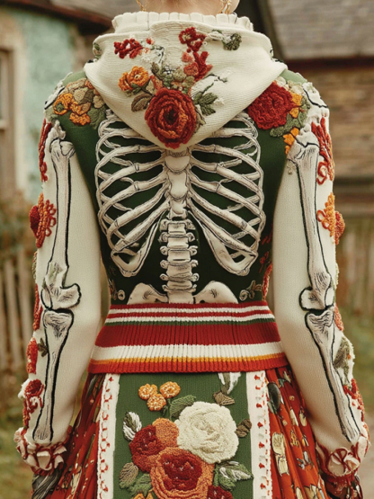 Vintage Halloween Anatomy Chunky And Skeleton Floral Knitted Hooded Sweater