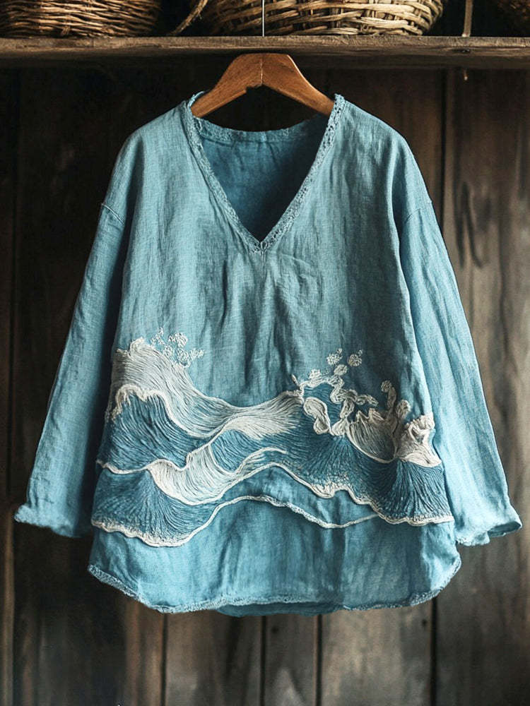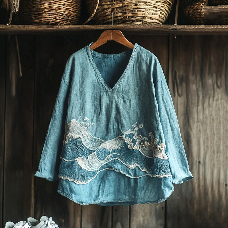 Vintage Japanese Waves Embroidered Linen Blend Cozy Tunic