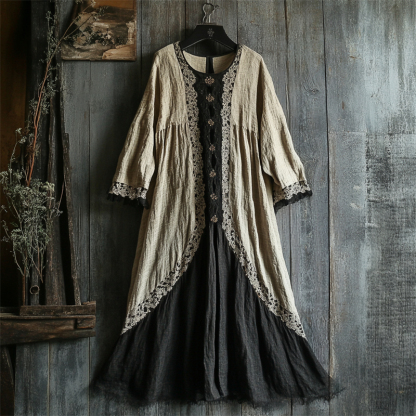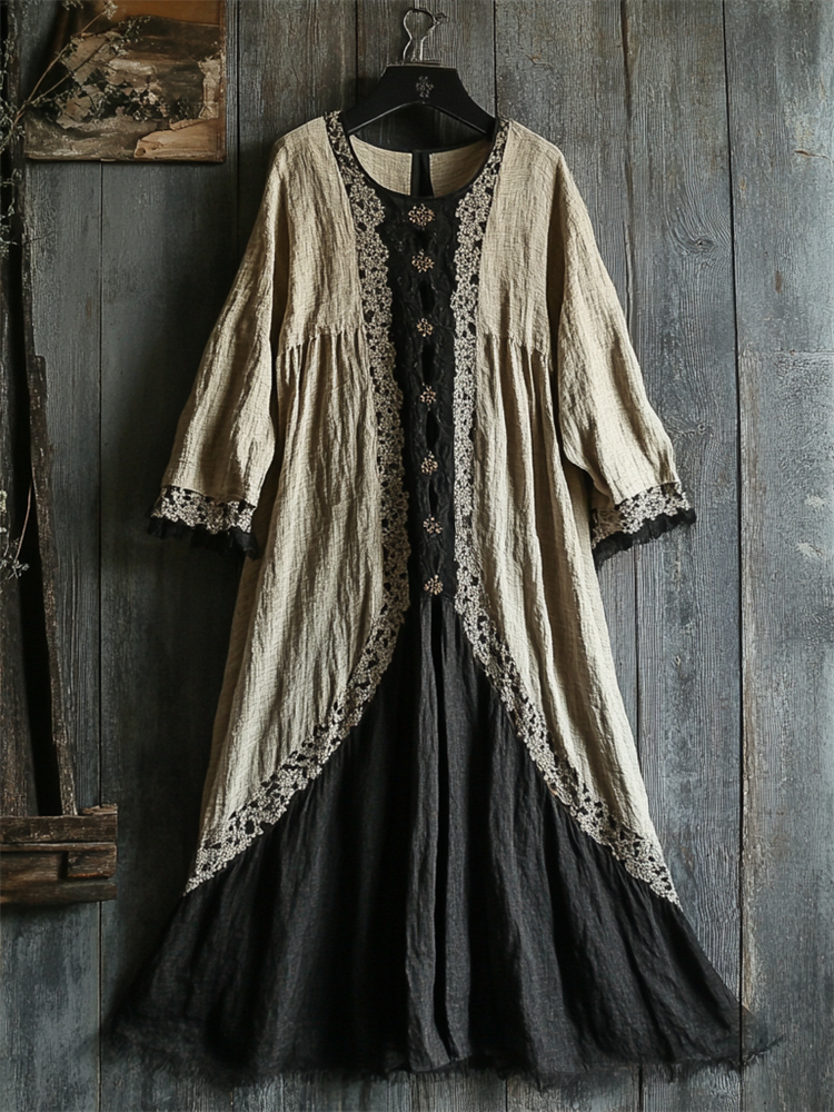 Vintage Lace Hem Contrast Linen Maxi Dress