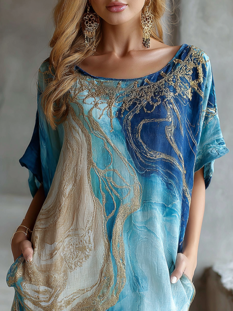 Vintage Marble Texture Collection Bohemia Gradient Black Gilded Pattern Linen Round Neck T-shirt