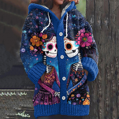 Vintage Mexican Day Of The Dead Floral Skull Knitted Cardigan Sweater