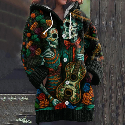 Vintage Mexican Day Of The Dead Music Skull Art Knitted Warm Sweater Cardigan