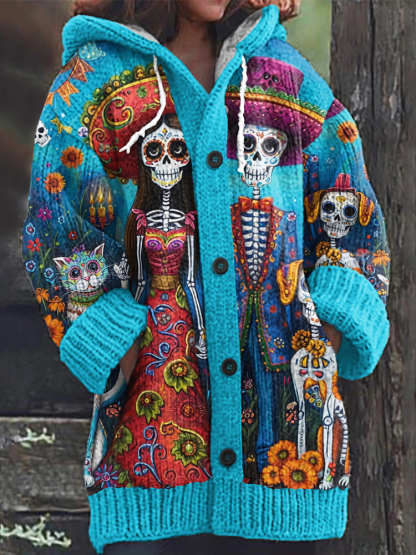 Vintage Mexican Day Of The Dead Skull Art Knitted Cardigan Sweater
