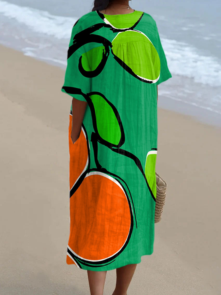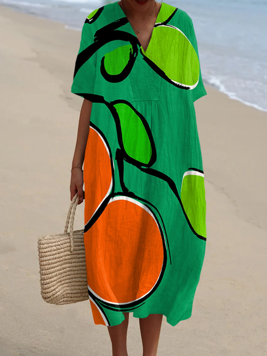Vintage Orange Tree Art Print V-Neck Midi Dress