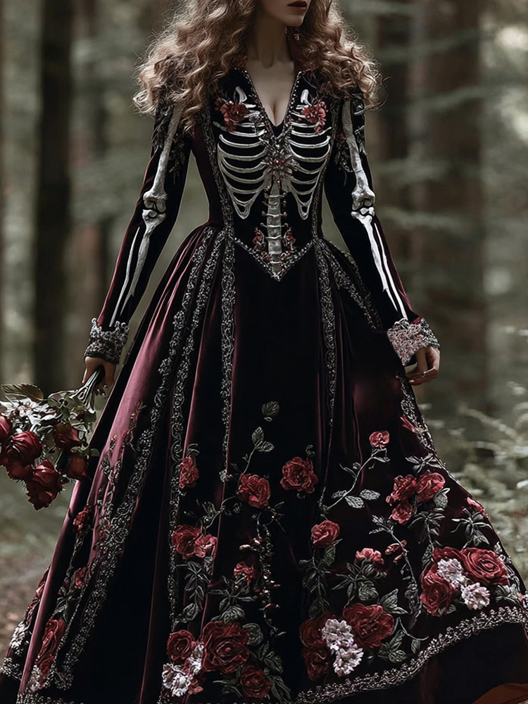 Vintage Skeleton Bones With Roses Flowy Velvet Maxi Dress