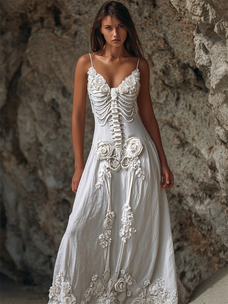 Vintage Skeleton White Roses Linen Cami Maxi Dress