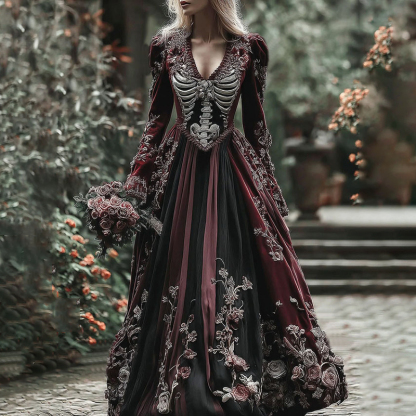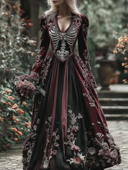 Vintage Skull Skeleton And Red Roses Flowy Maxi Dress
