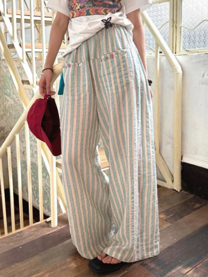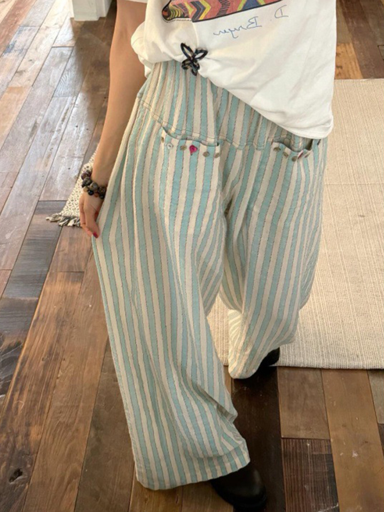 Vintage Stripe Linen Blend Wide Leg Casual Pants