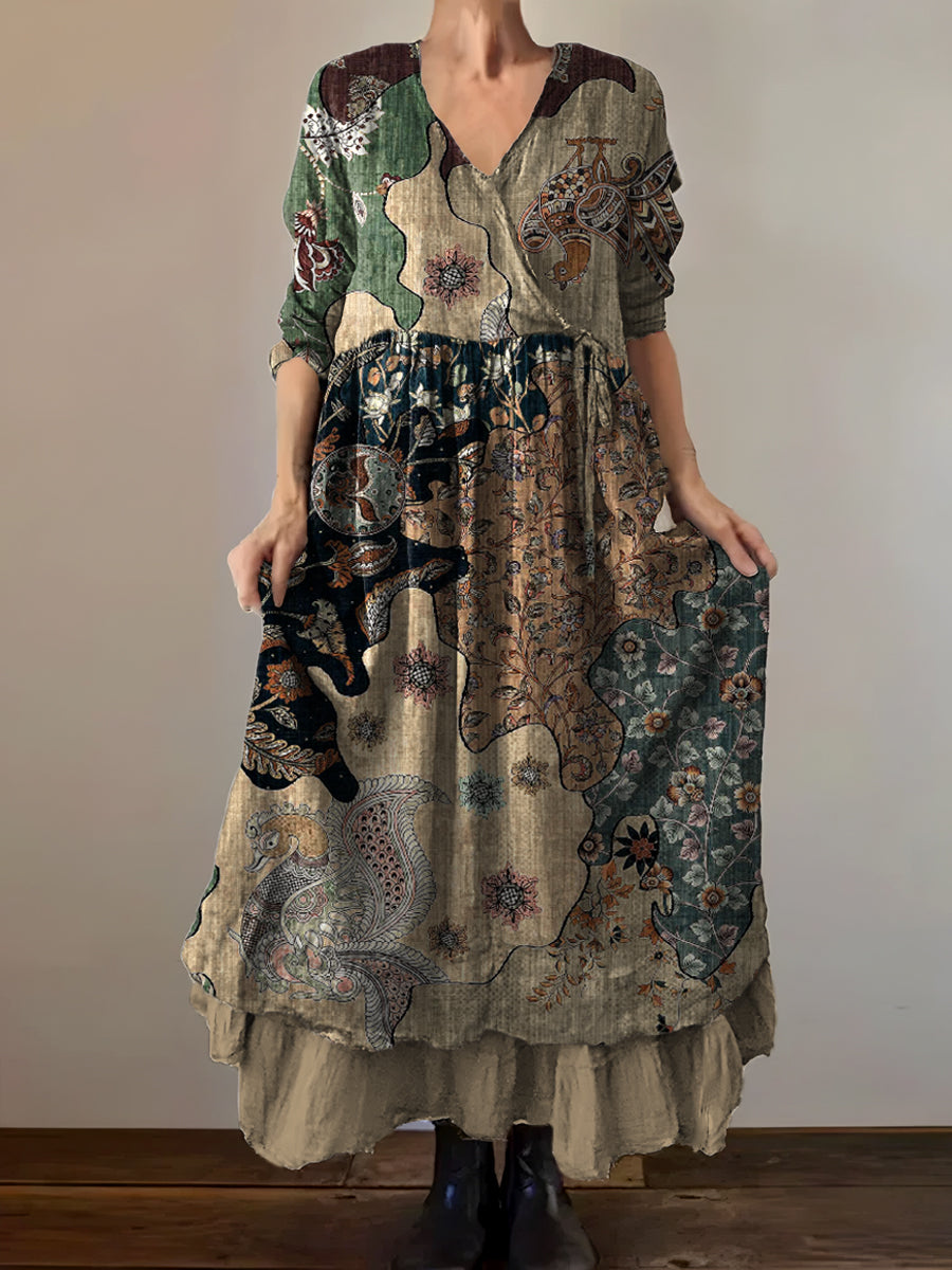 Vintage V-Neck Bohemian Floral Print Elegant Chic Loose Midi Dress