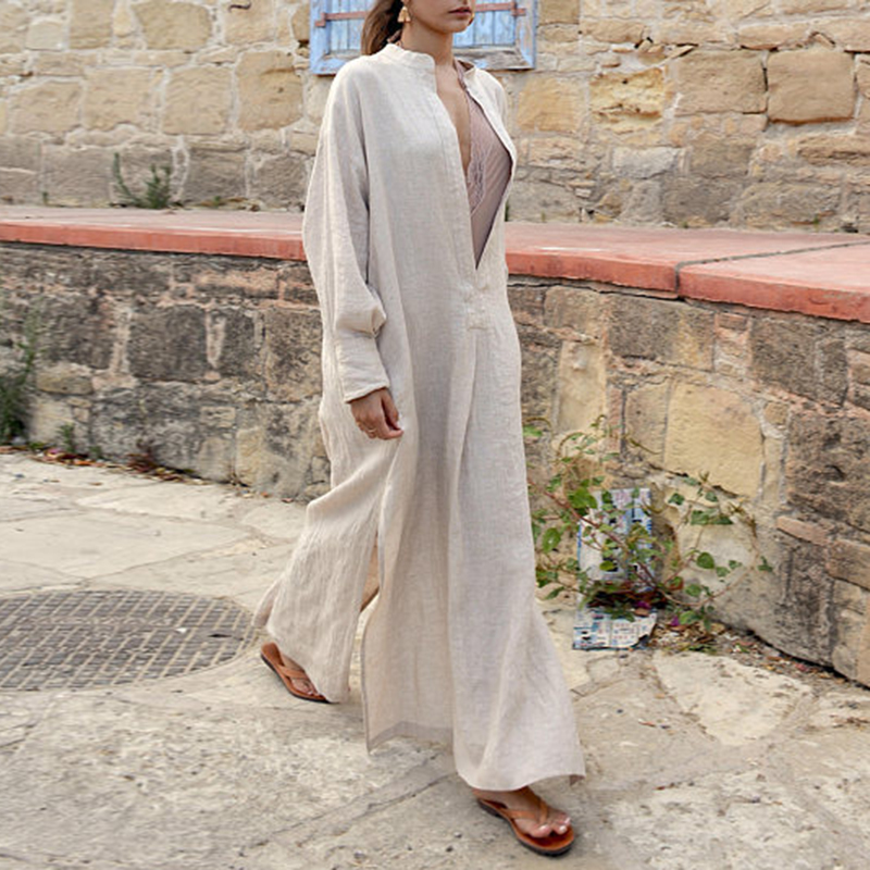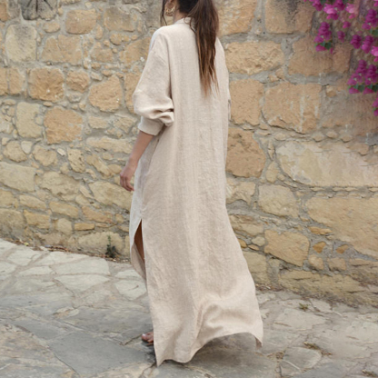 Vintage V Neck Split Linen Cotton Comfy Maxi Dress