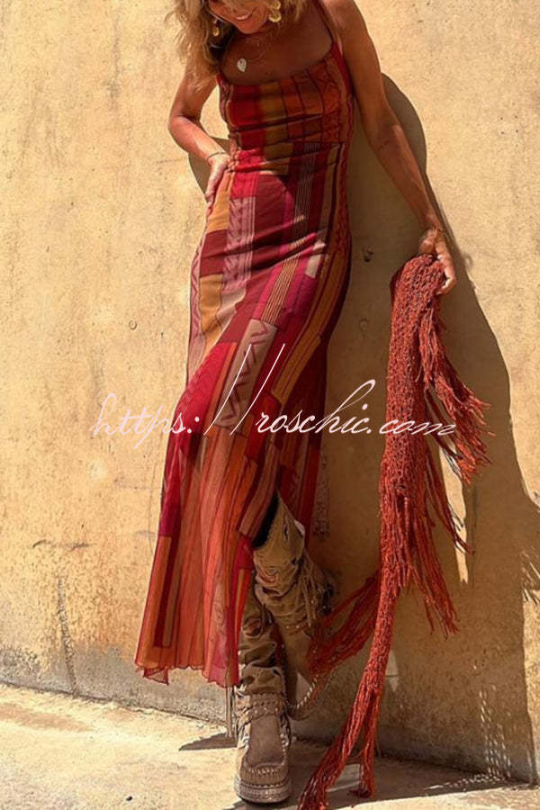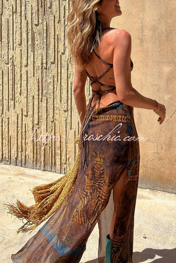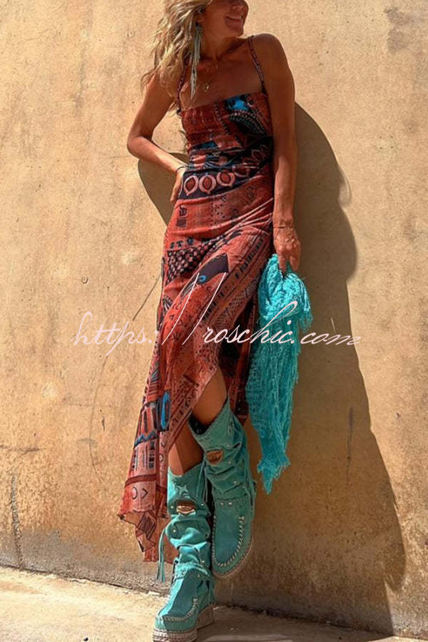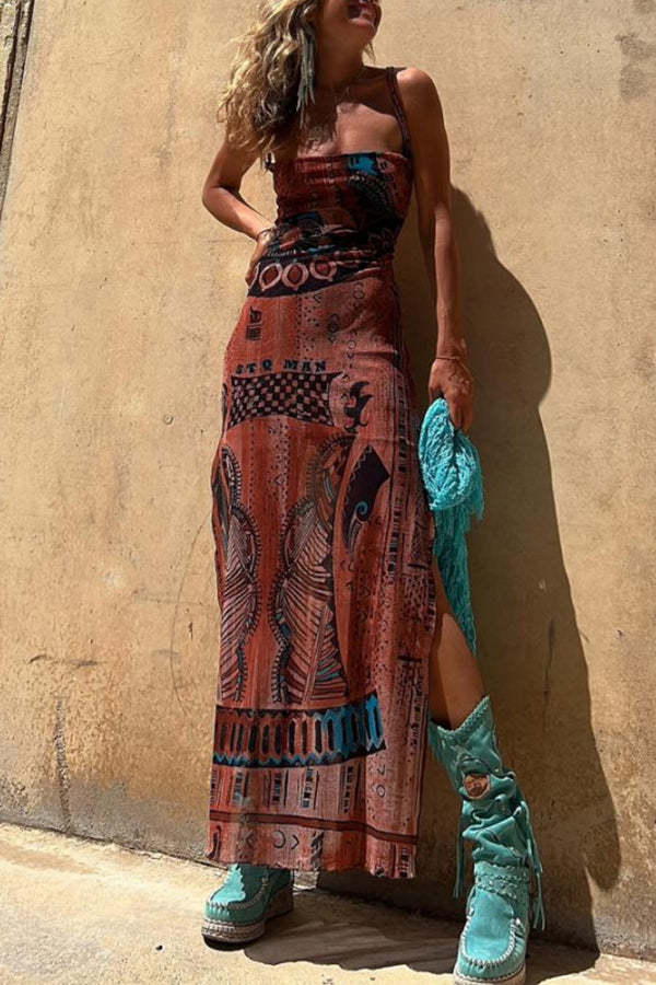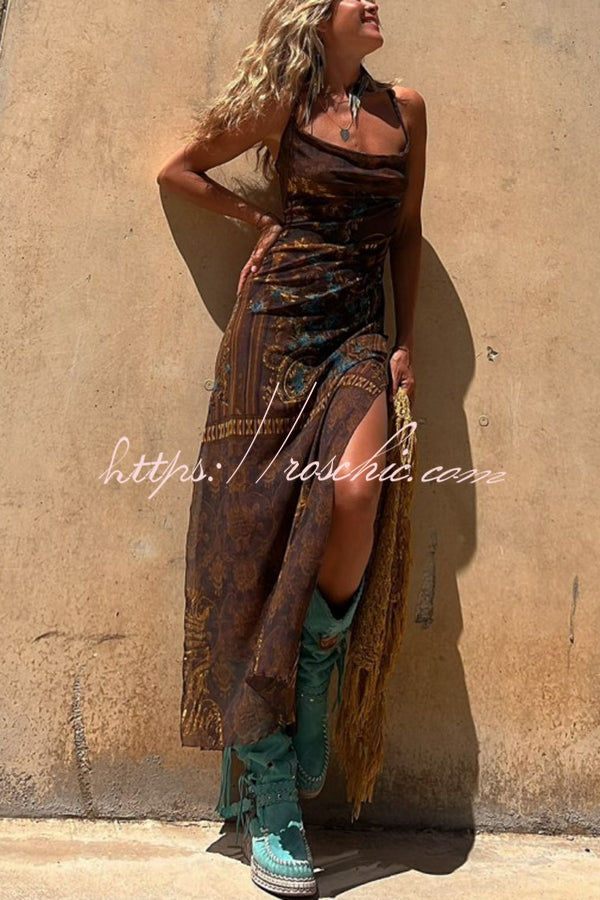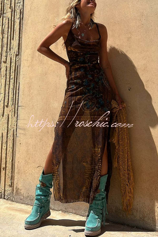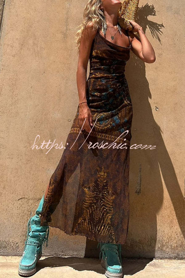 Gypsy Style Unique Print Cowl Neck Back Lace-up Slit Midi Dress