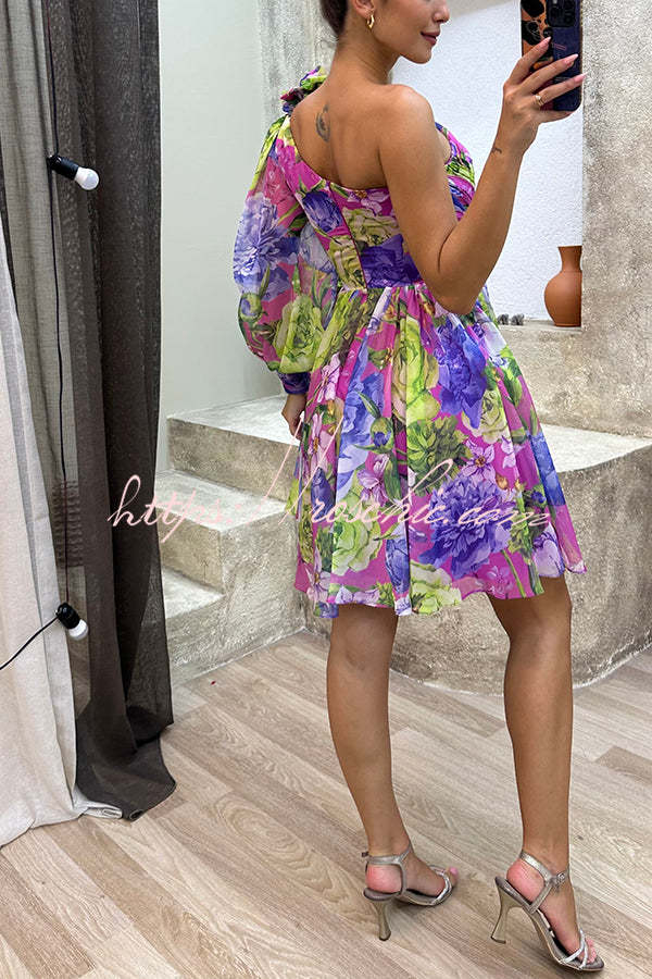 Vivid Visions Floral Print Pleated One Shoulder Sleeve Swing Mini Dress