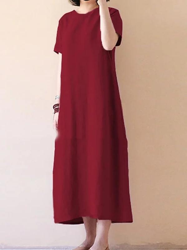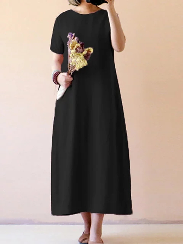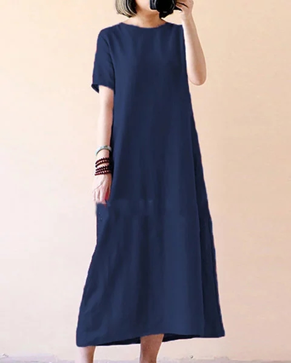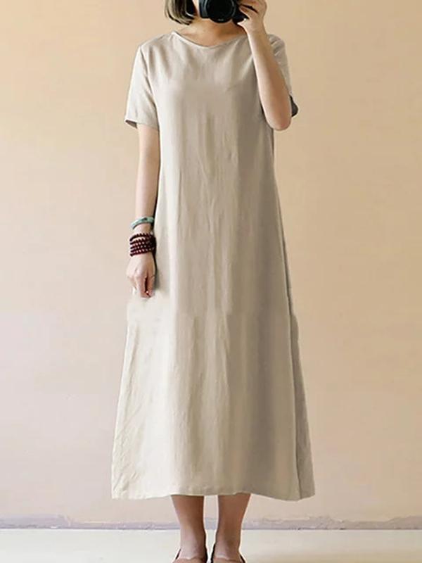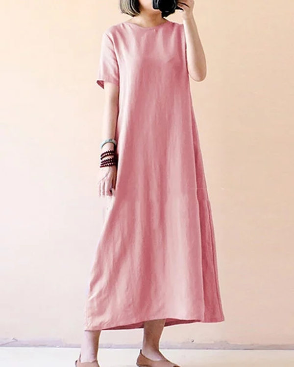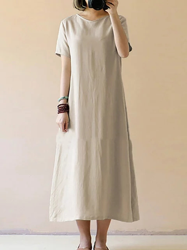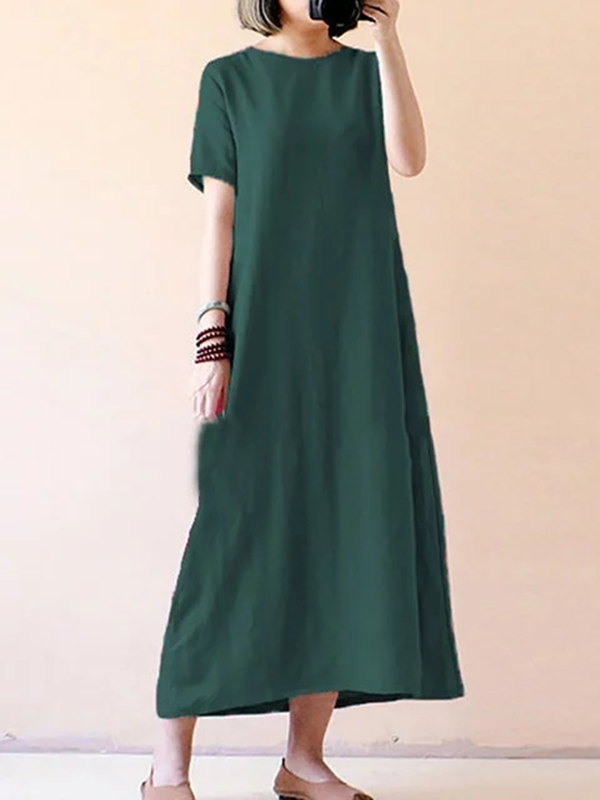 Women Casual Short Sleeve Solid Cotton Plus Size Dress
