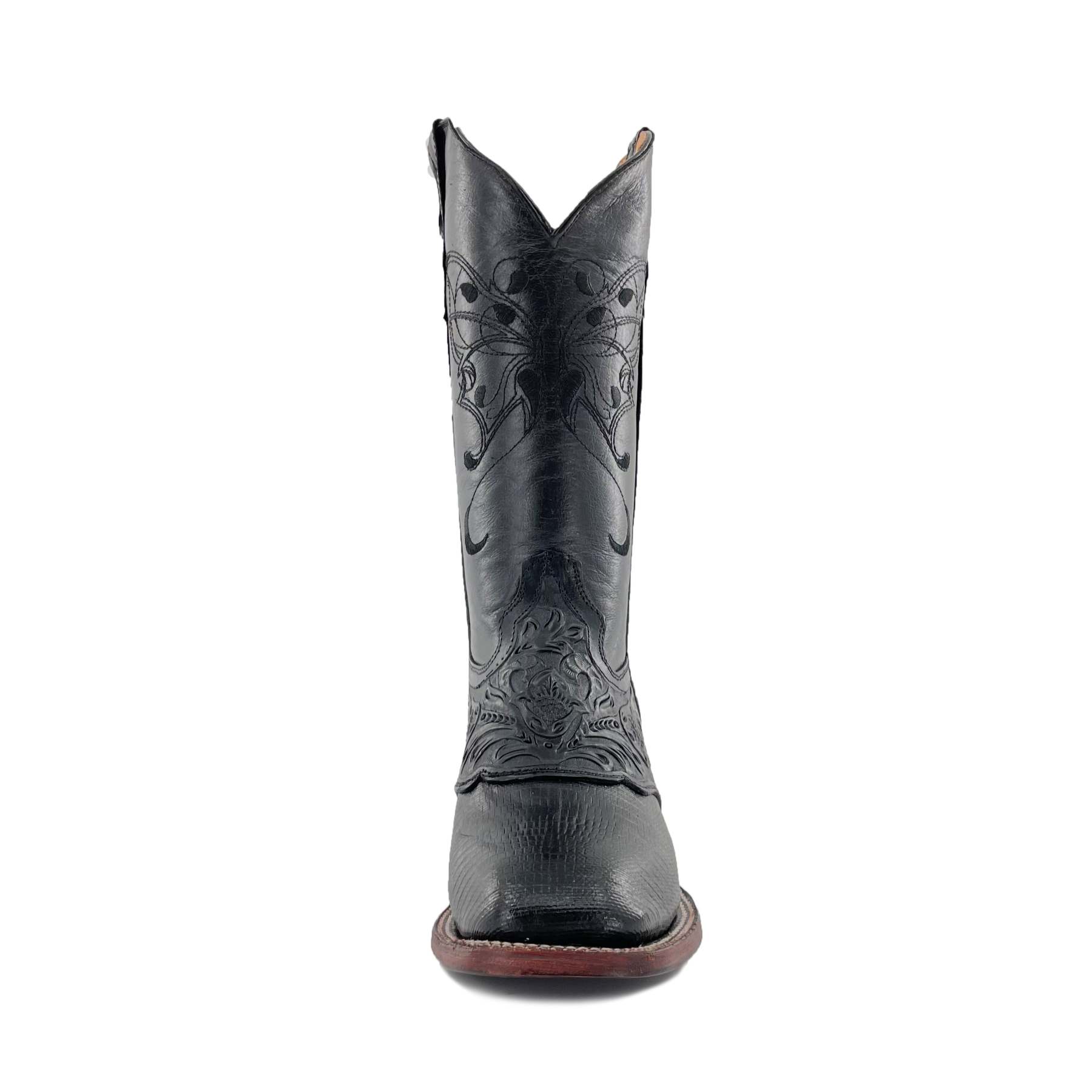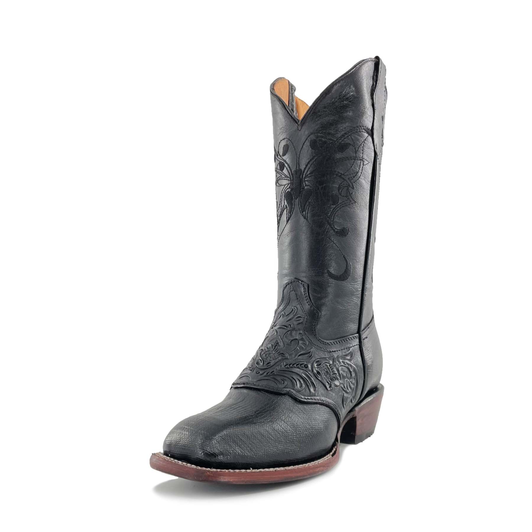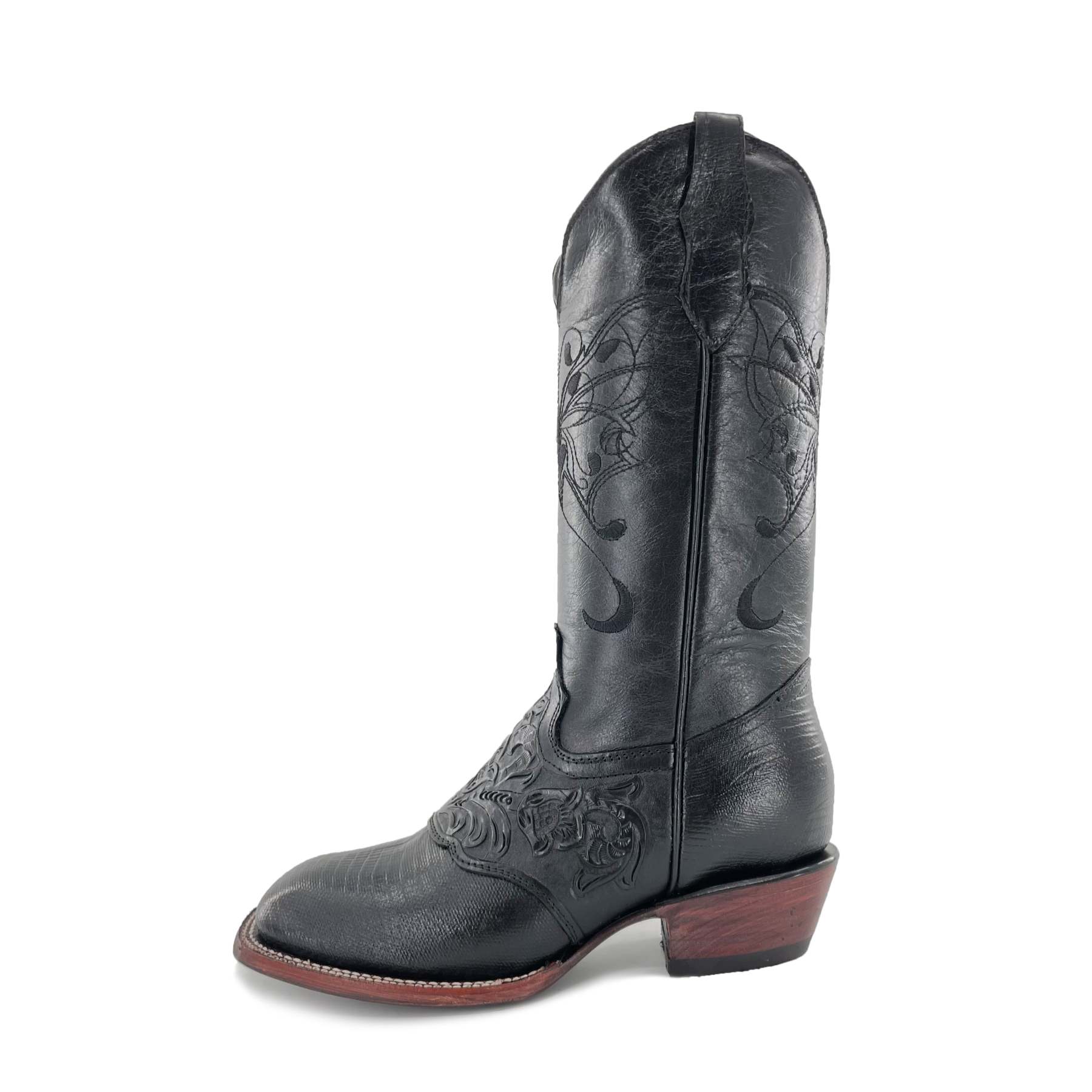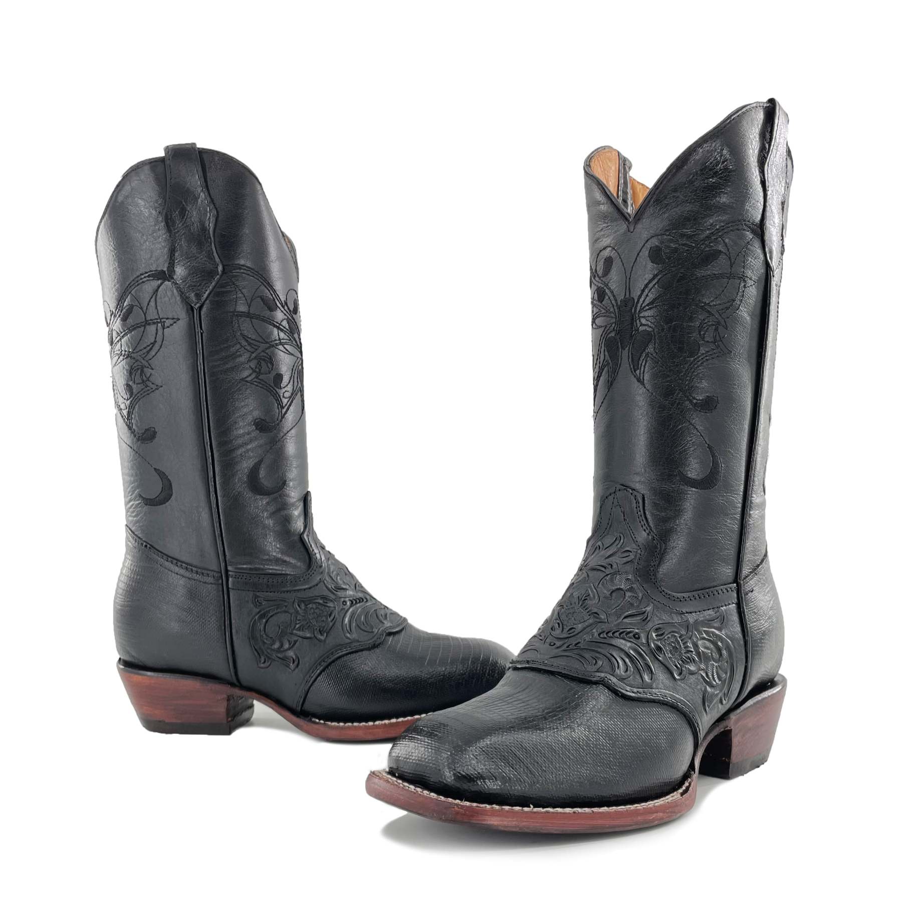 Slip into style with these exquisitely crafted Women's French Hand Tooled Black Boots. Featuring handtooled flower patron details and printed lizard on leather - all handcrafted for a classic Western look - these boots offer timeless style with a modern touch. Step into luxury with a pair of your own.