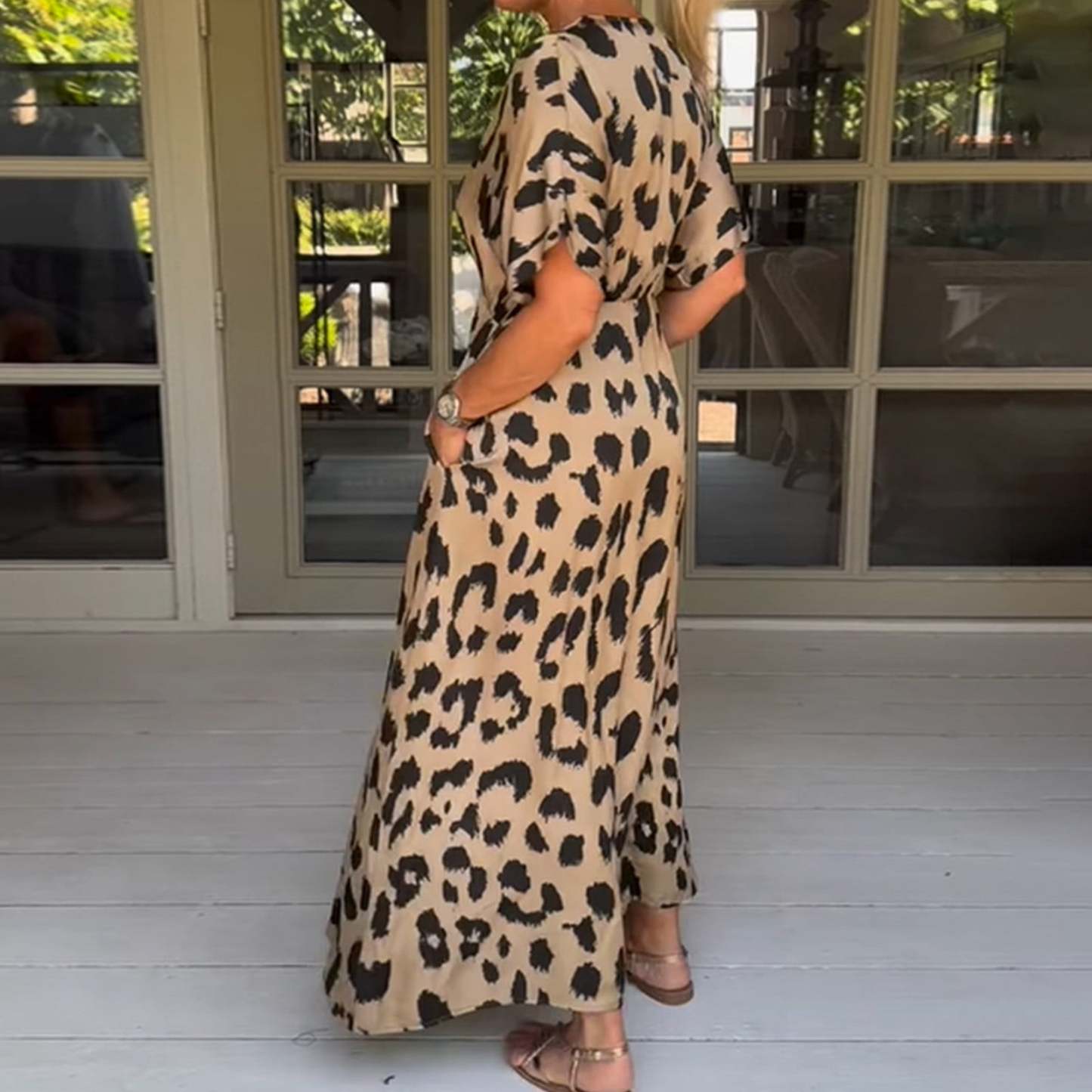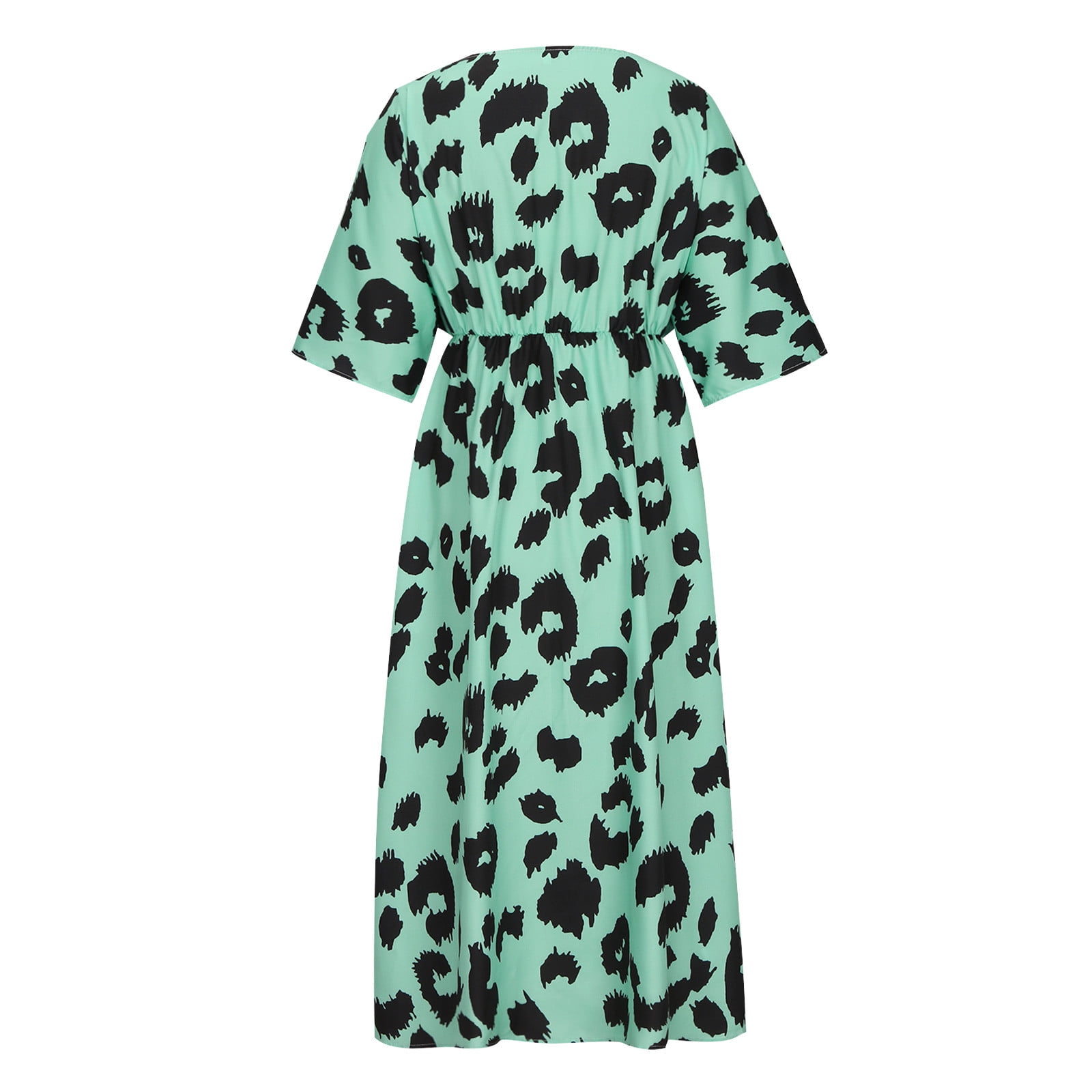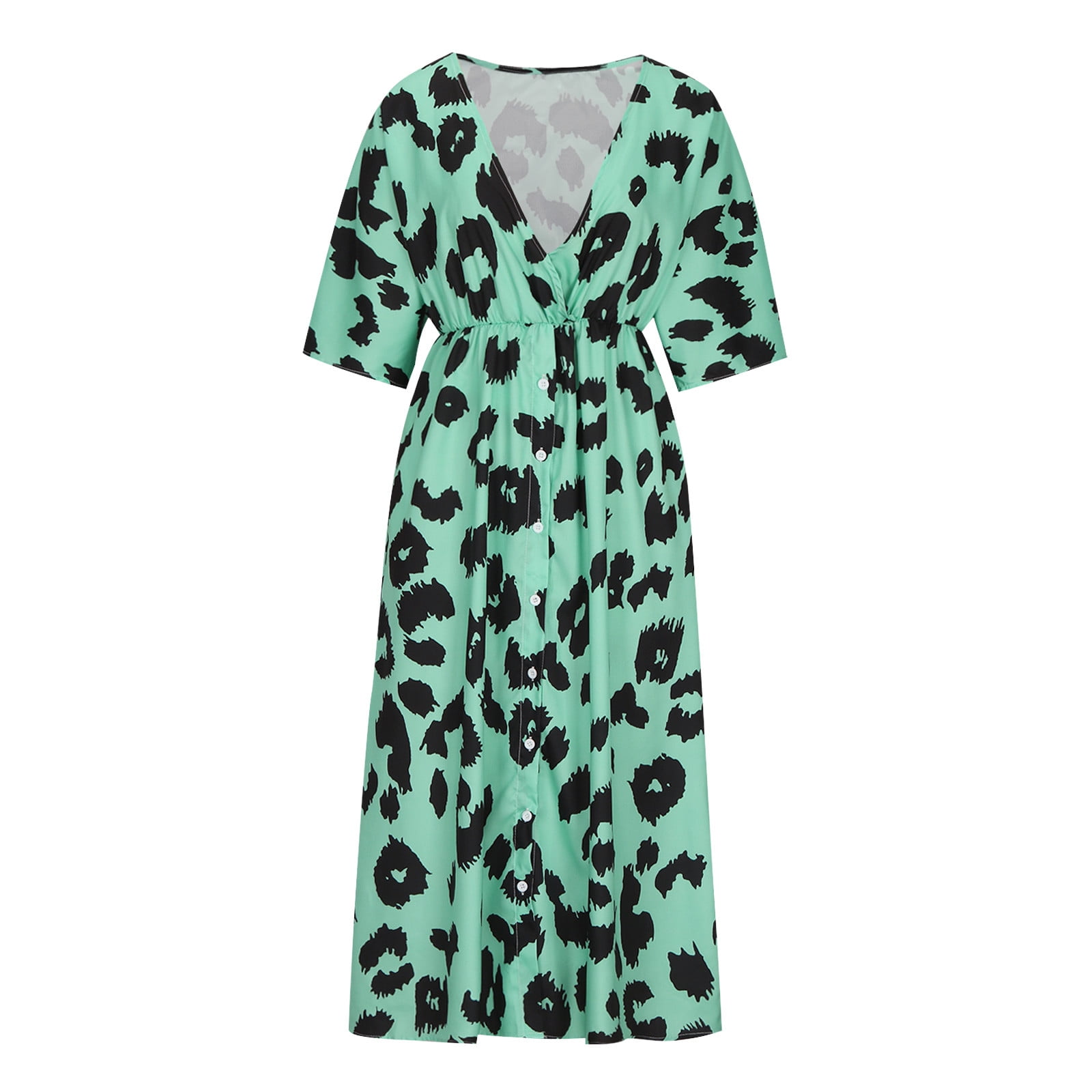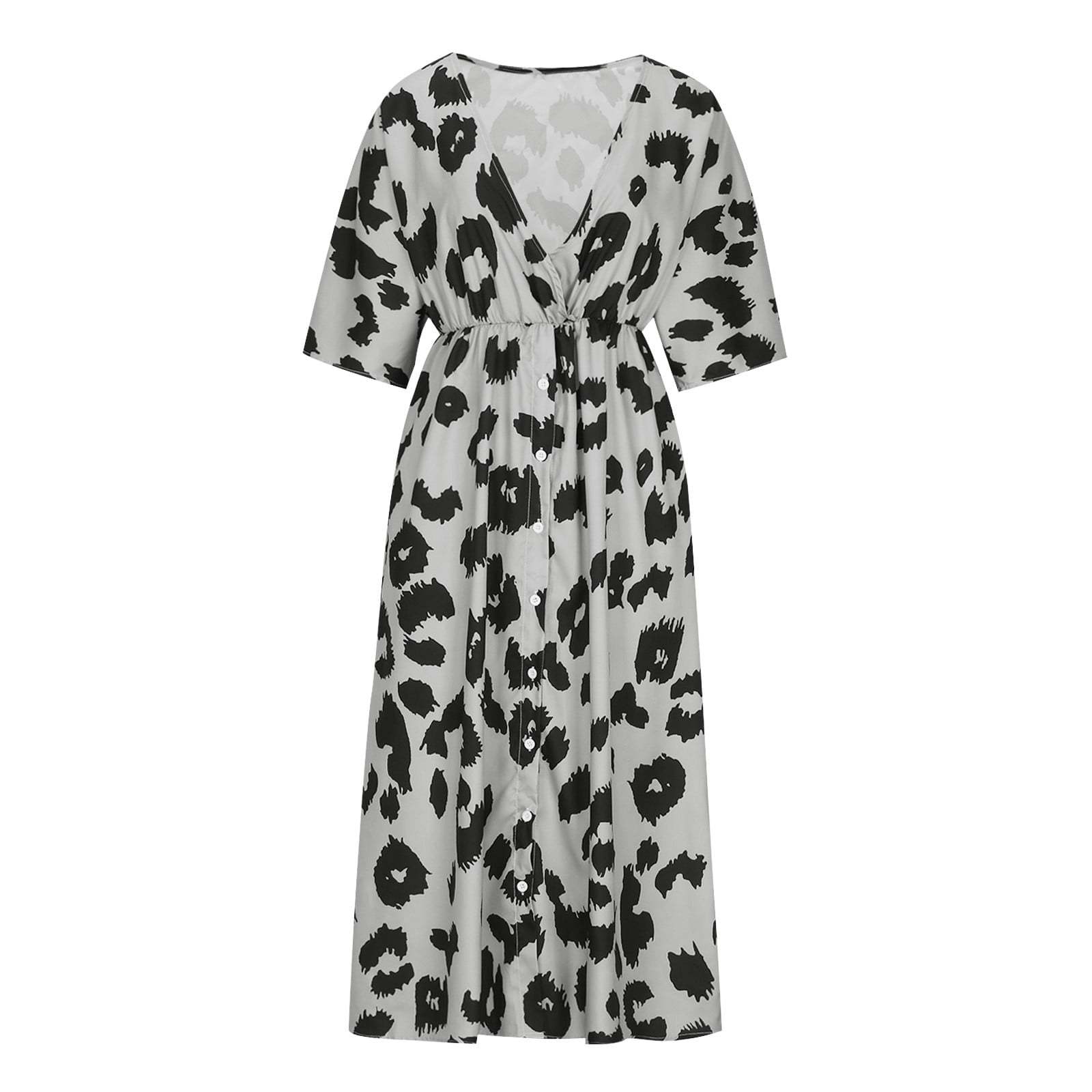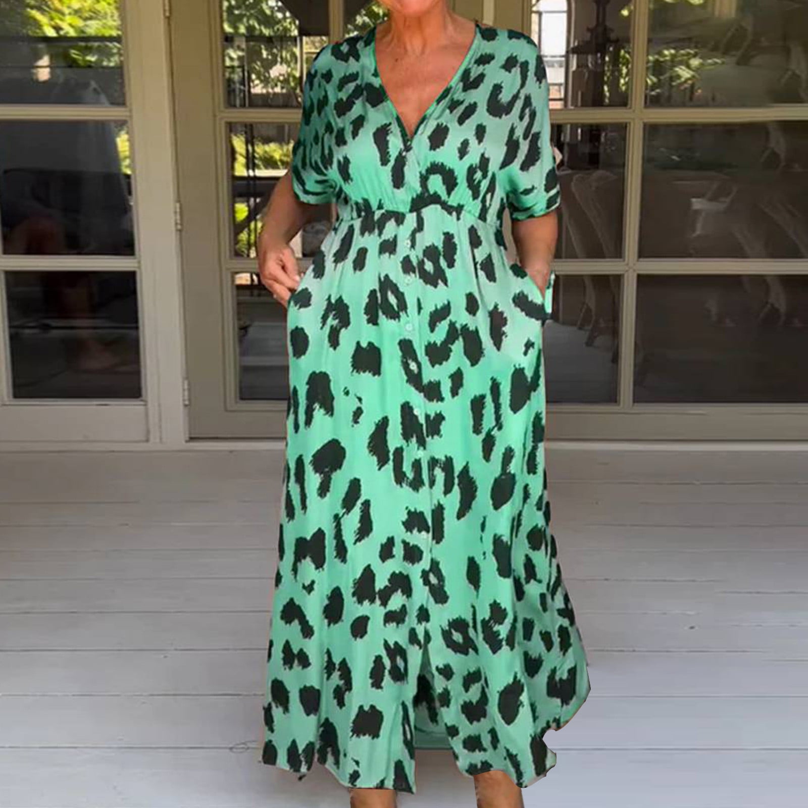 Women's Summer Maxi Dress Casual Short Sleeve Leopard Print V Neck Long Front Slit Dresses with Pocket