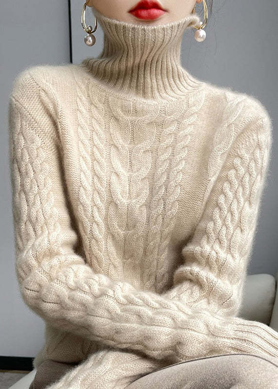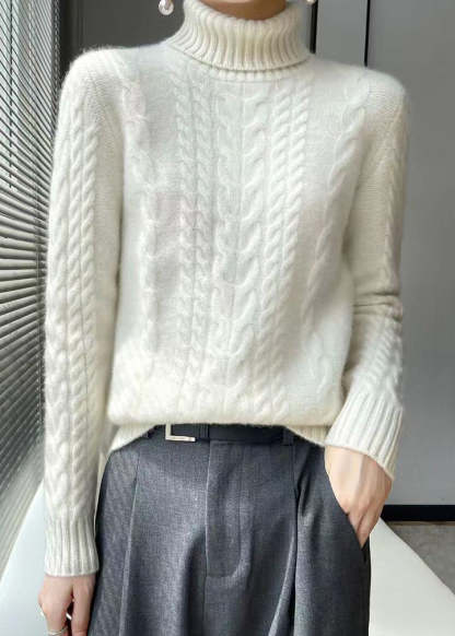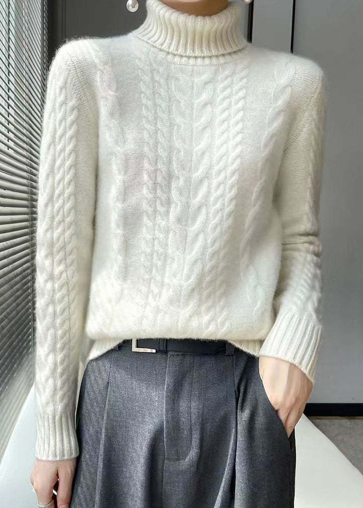 Women White Turtleneck Wool Cable Knit Sweaters Long Sleeve