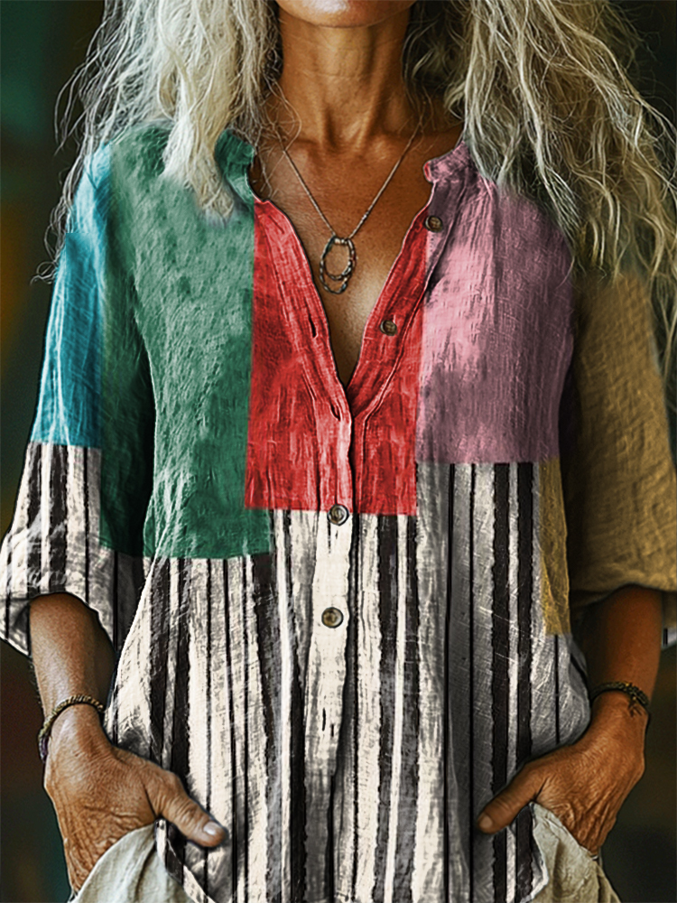 Women's Abstract Geometry Art Print Casual Cotton Linen Shirt