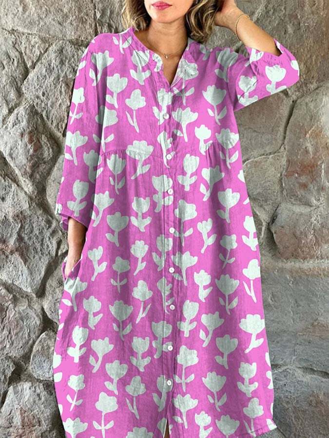Women's Art Botanical Floral Print Single Breasted Dress