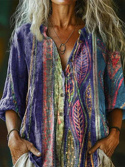 Women's Art Painting Ethnic Style Fallen Leaves Retro Print Long Sleeve Shirt