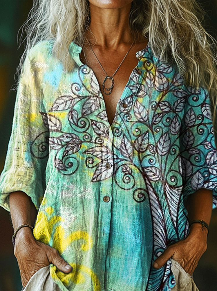 Women's Art Painting Ethnic Style Gradient Color Floral Retro Print Long Sleeve Shirt