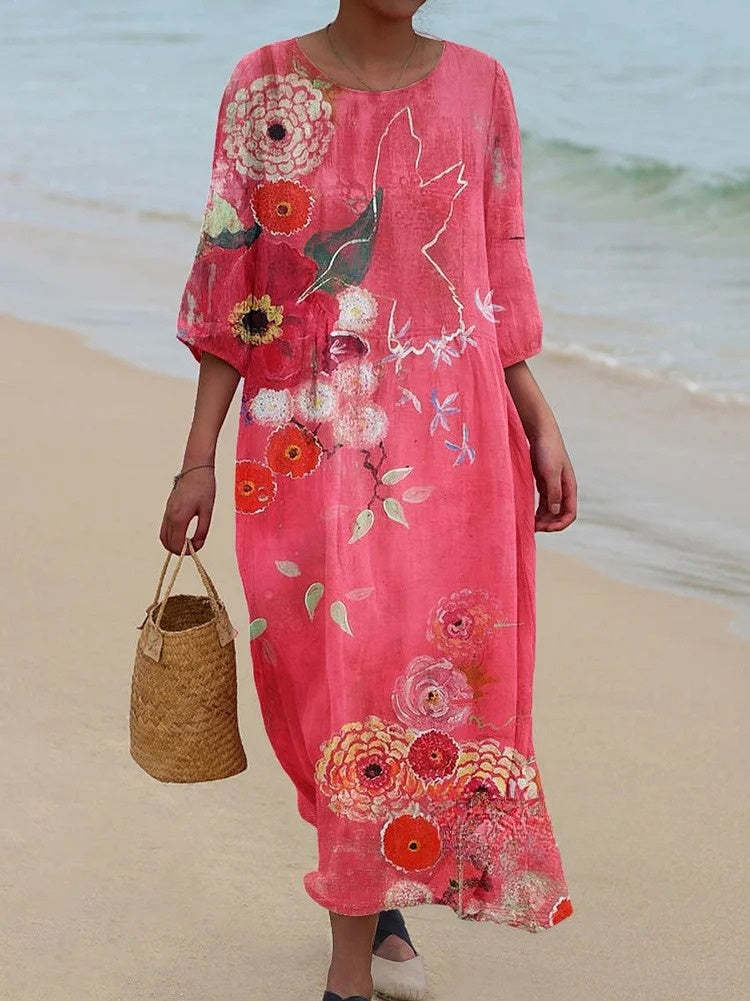 Women's Artistic Floral Pattern Pocket Cotton Dress
