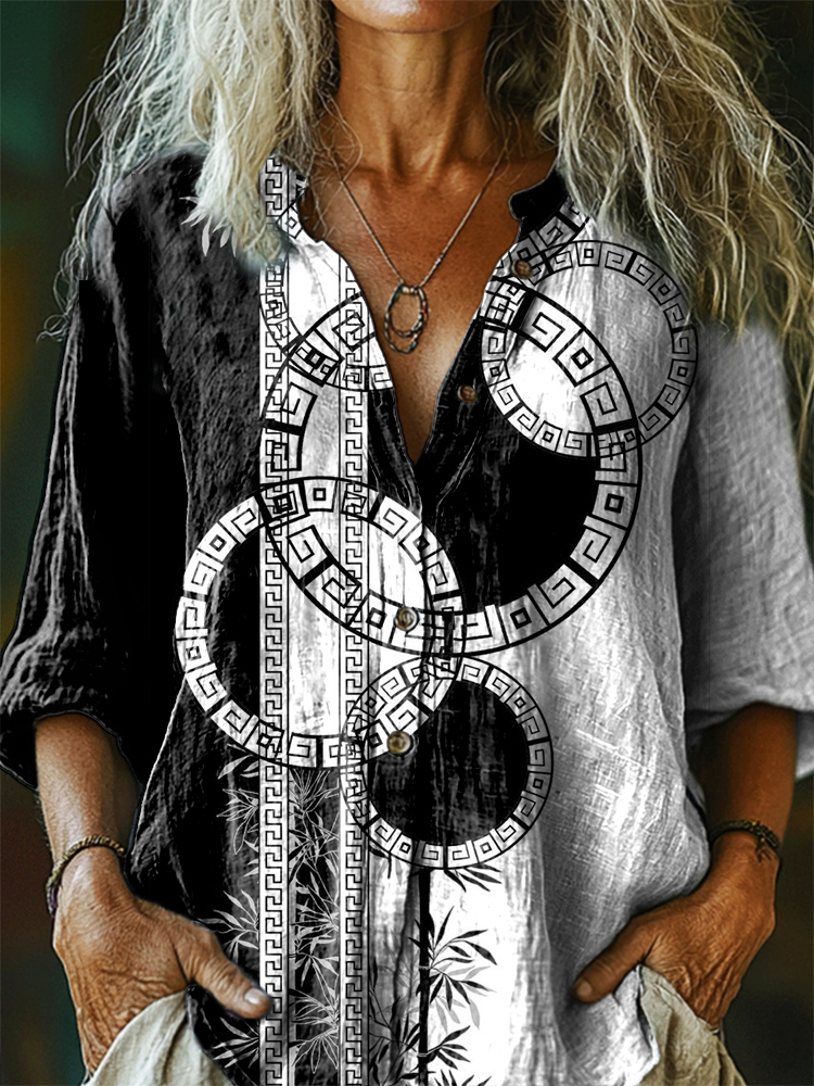 Women's Bamboo Retro Zigzag Pattern Art Print Casual Cotton and Linen Shirt