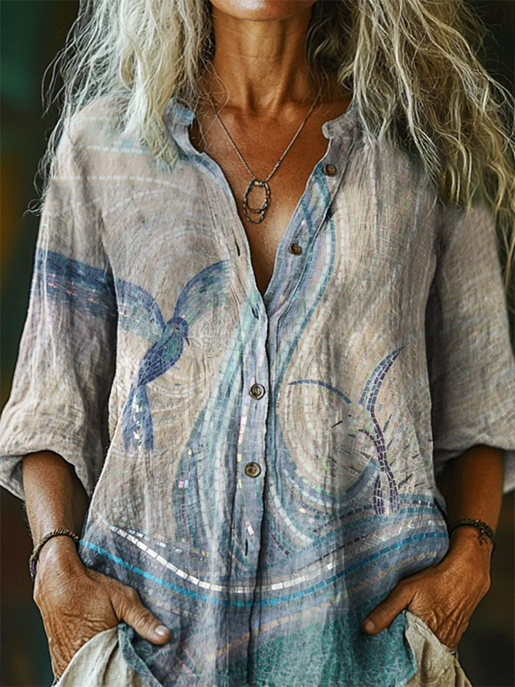 Women's Bird Pattern Art Print Casual Cotton Linen Shirt
