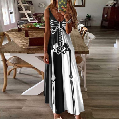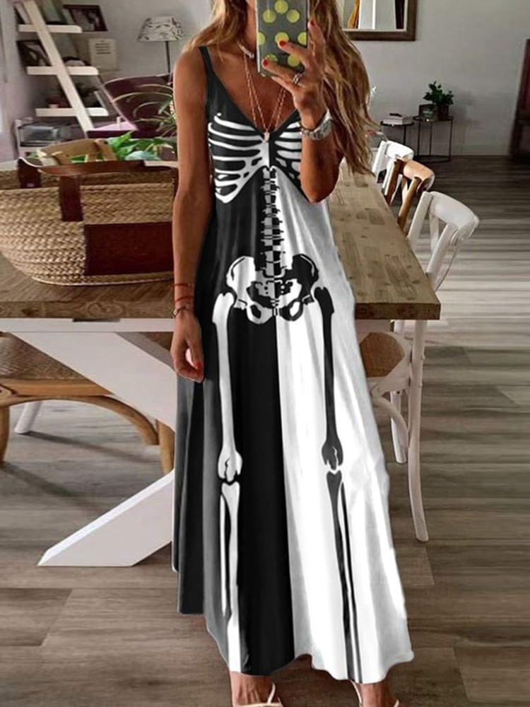 Women's Black And White Halloween Skull Print Casual Maxi Dress