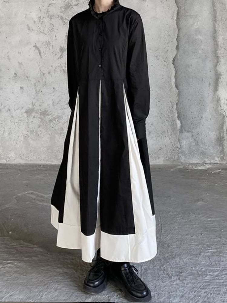 Women's Black and White Patchwork Stand-up Collar Hem Vintage Dresses