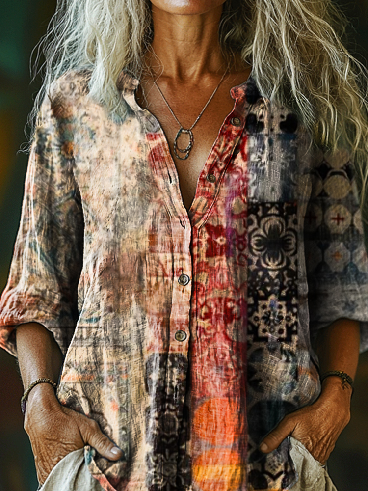 Women's Bohemian Floral Art Print Casual Cotton Linen Shirt