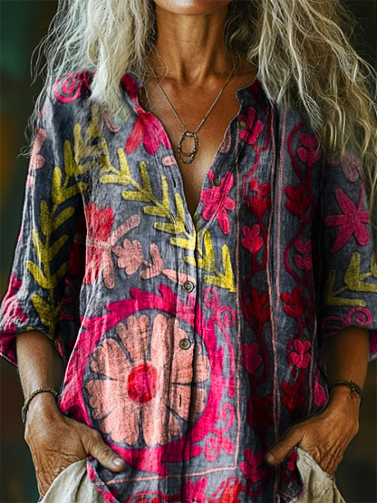 Women's Bohemian Floral Art Print Casual Cotton Linen Shirt