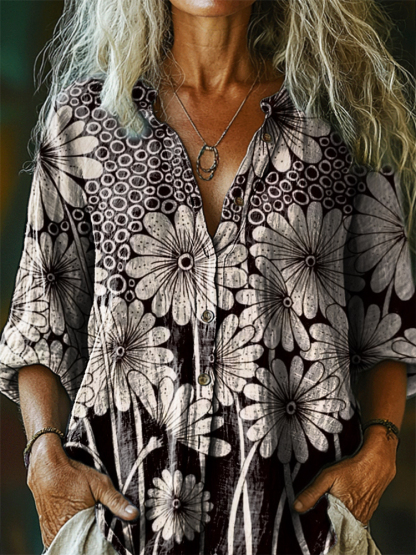 Women's Bohemian Floral Art Print Casual Cotton Linen Shirt