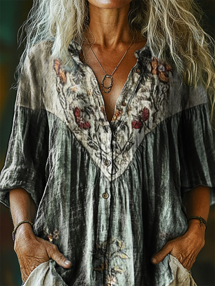 Women's Bohemian Floral Art Print Casual Cotton Linen Shirt