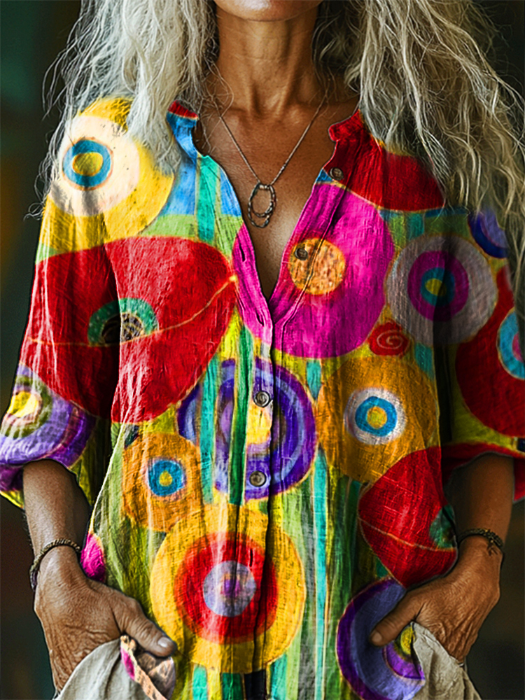 Women's Bohemian Floral Art Print Casual Cotton Linen Shirt