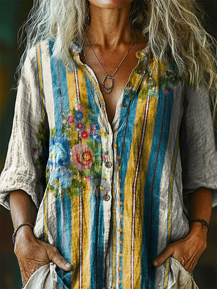 Women's Bohemian Floral Art Print Casual Cotton Linen Shirt