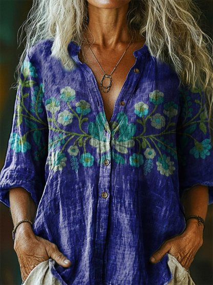 Women's Bohemian Floral Art Print Casual Cotton Linen Shirt