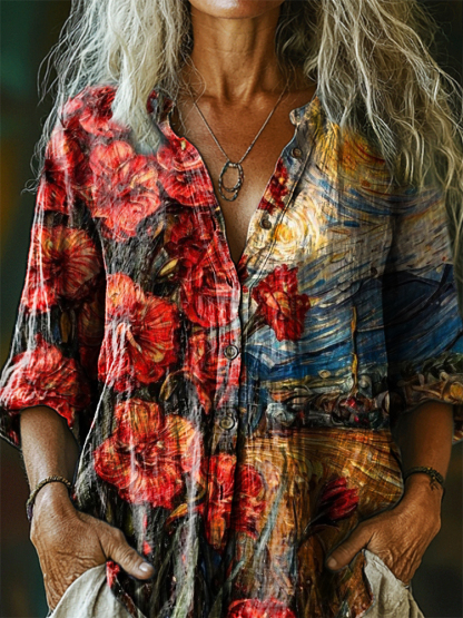 Women's Bohemian Floral Art Print Casual Cotton Linen Shirt