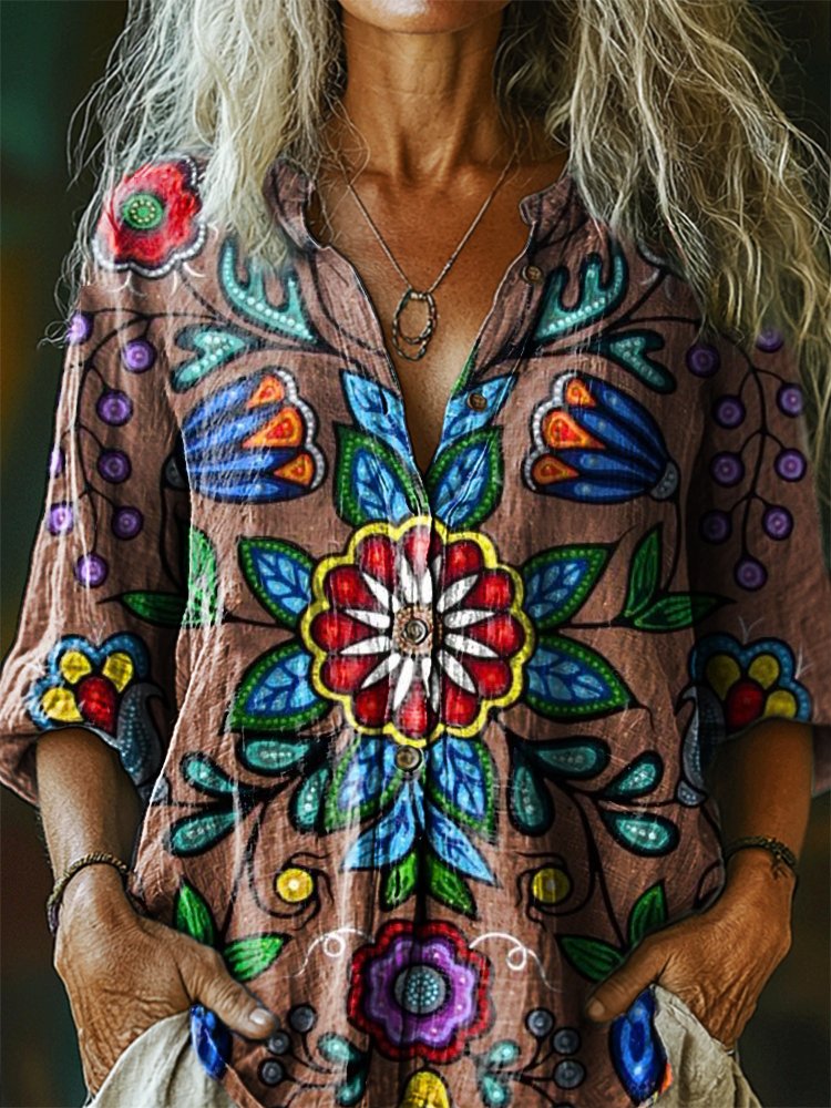 Women's Bohemian Floral Art Print Casual Cotton Linen Shirt
