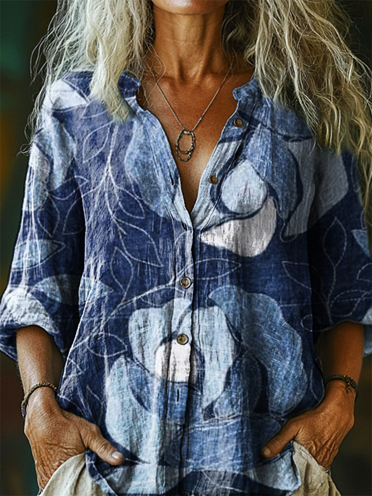 Women's Bohemian Floral Art Print Casual Cotton Linen Shirt